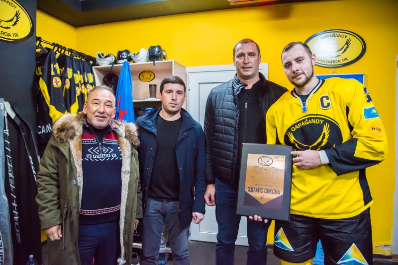 Дмитрий Карпов вручил Эдгарсу Сиксне памятную табличку по случаю 300 сыгранных матчей за ХК Сарыарка