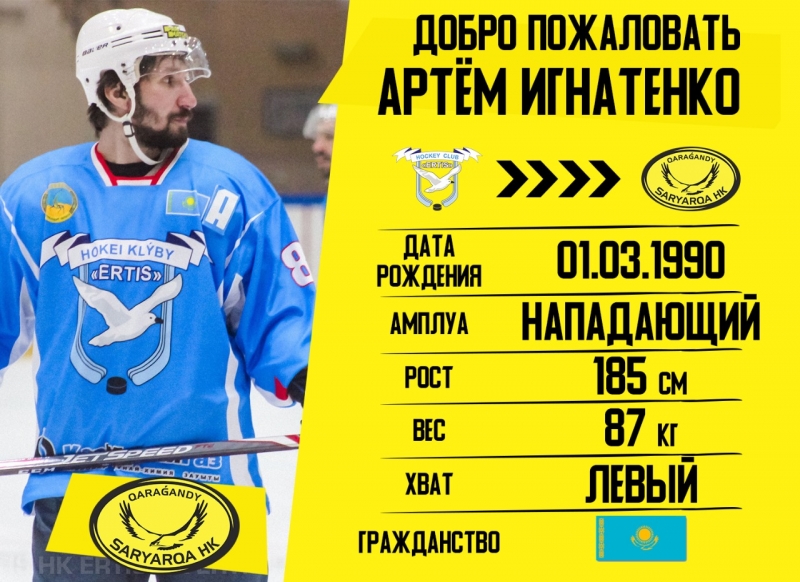 Нападающий «Иртыша» Артем Игнатенко пополнит состав карагандинской «Сарыарки». Артем родился в Нур-Султане, где и начал карьеру хоккеиста выступая за молодежку столичного «Барыса-2». Он является Лучшим игроком сборной Казахстана U20 на Молодежном Чемпионате Мира 1 дивизиона сезона 2009-10. Серебряный призер Универсиады сезона 2013-2014. В нынешнем сезоне Артем провел 33 игры, в них забросил 3 шайбы, совершил 7 ассистов и заработал 10 очков.