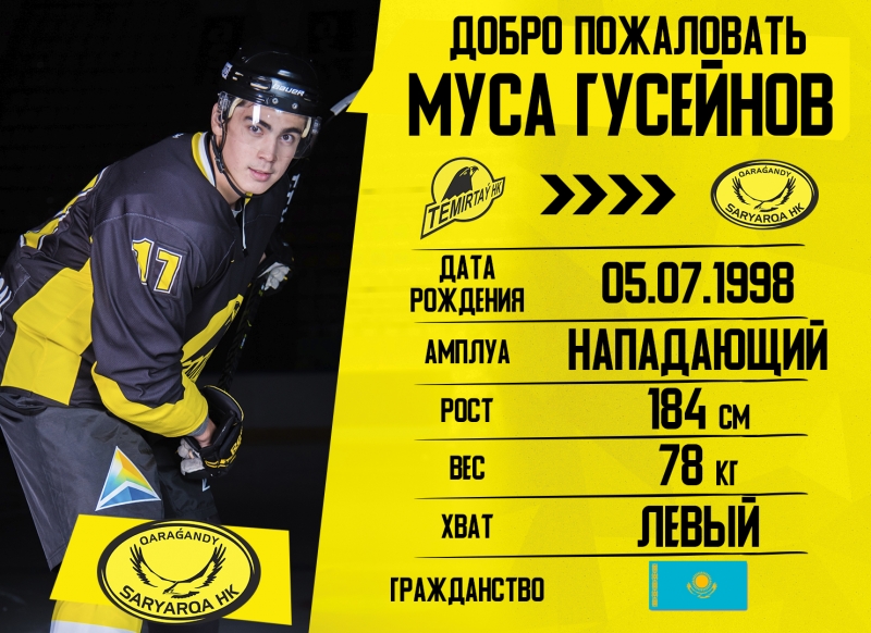Гуейнов Муса Фазилулы, родился 5 июля 1998 г. Воспитанник карагандинского хоккея. Дважды вызывался в молодежную сборную Казахстана. Состав "Темиртау" пополнил в минувшем сезоне. В 57 матчах забросил 11 шайб и отдал 18 результативных передач.