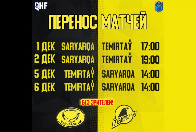 Матчи между "Сарыаркой" и "Темиртау" перенесены на 1 и 2 декабря, ответные встречи - на 5 и 6 декабря.