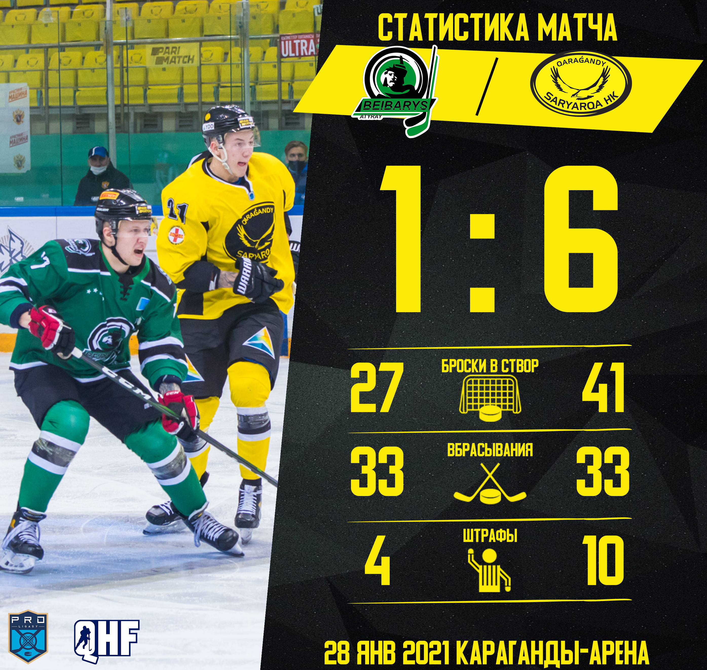 В заключительной части матча Карагандинская «Сарыарка» не оставила Атыраусцам шансов на победу. «Черно-желтые» были настроены забивать и забивать. С задачей они справились. На 45 минуте с передачи Александра Борисевича и Степана Грымзина пятую шайбу забросил Сергей Голоднюк. Спустя 6 минут Сергей Голоднюк оформил дубль, забив пятую шайбу «Бейбарысу». Безоговорочная победа «орлов» 6:1!